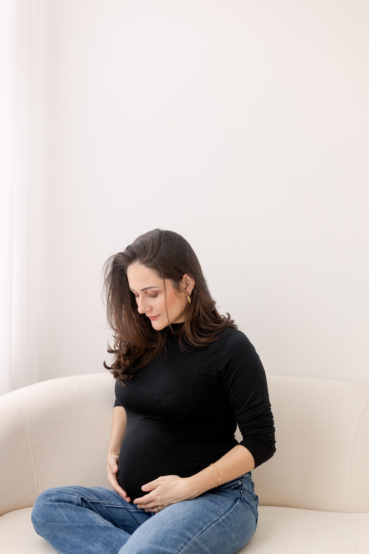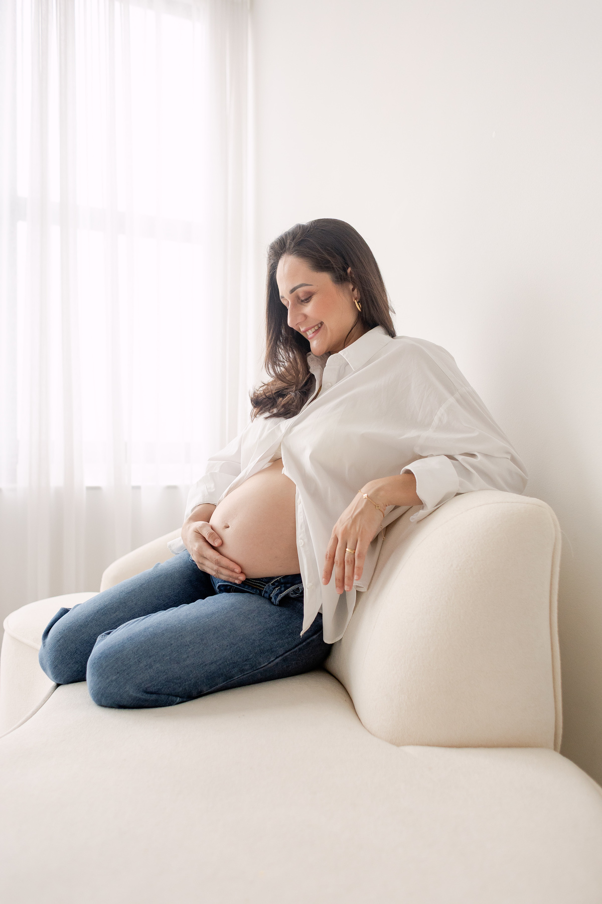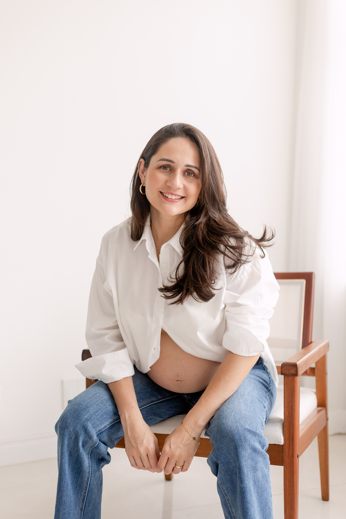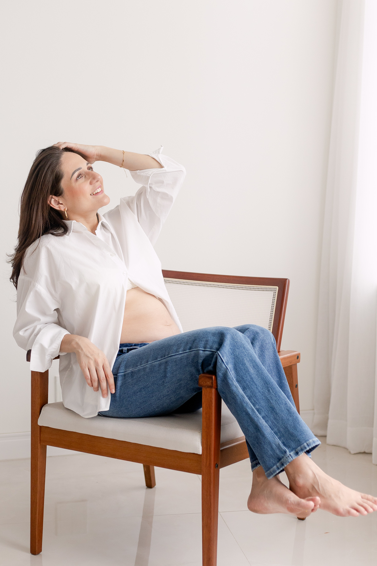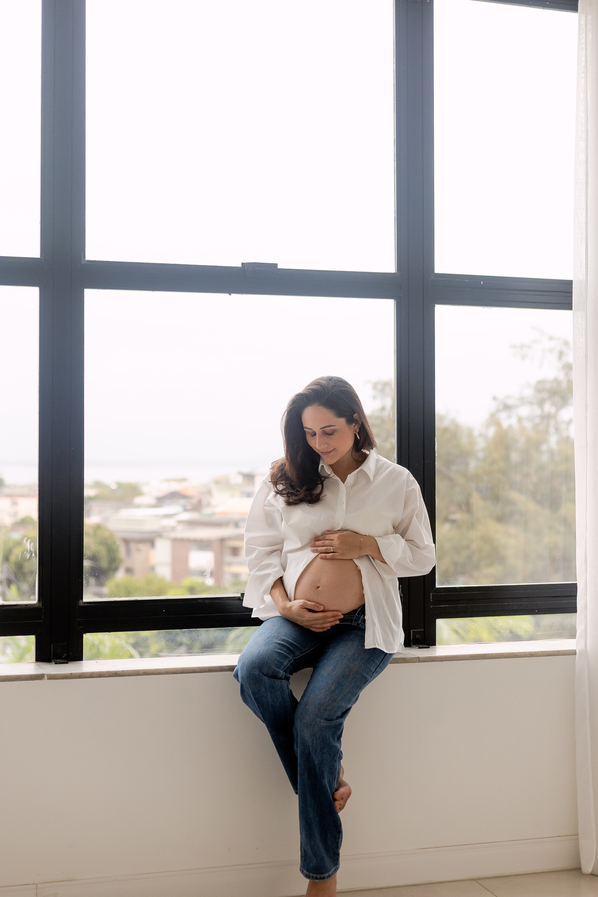 Ensaio de gestante no nosso estúdio minimalista de luz natural na Ilha do Governador. Com estilo leve e atemporal!