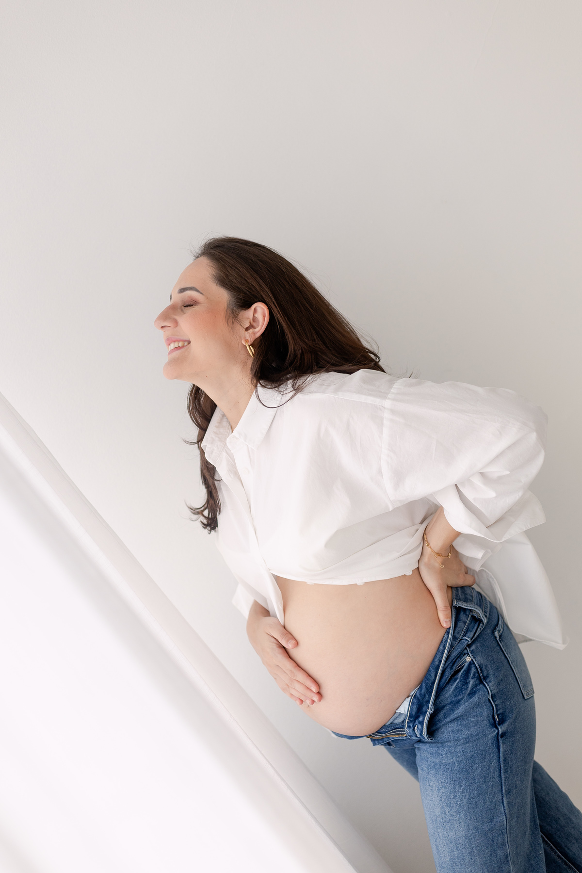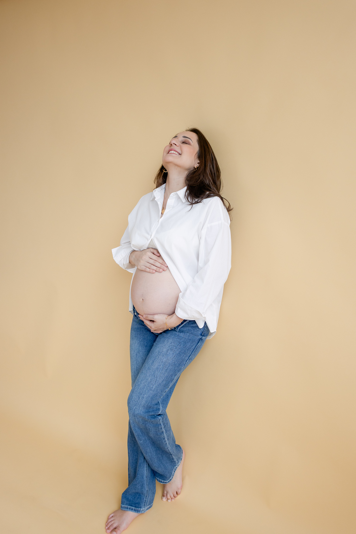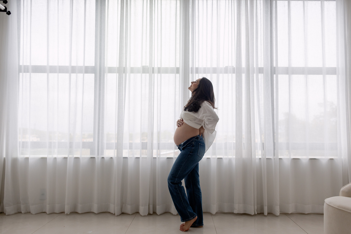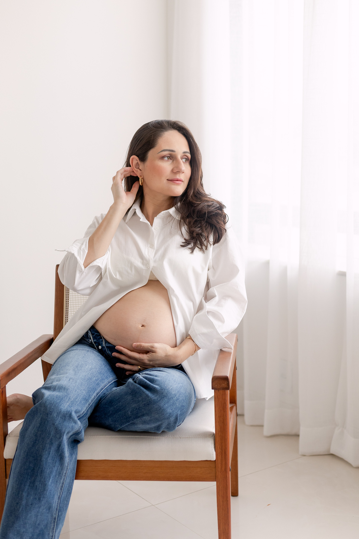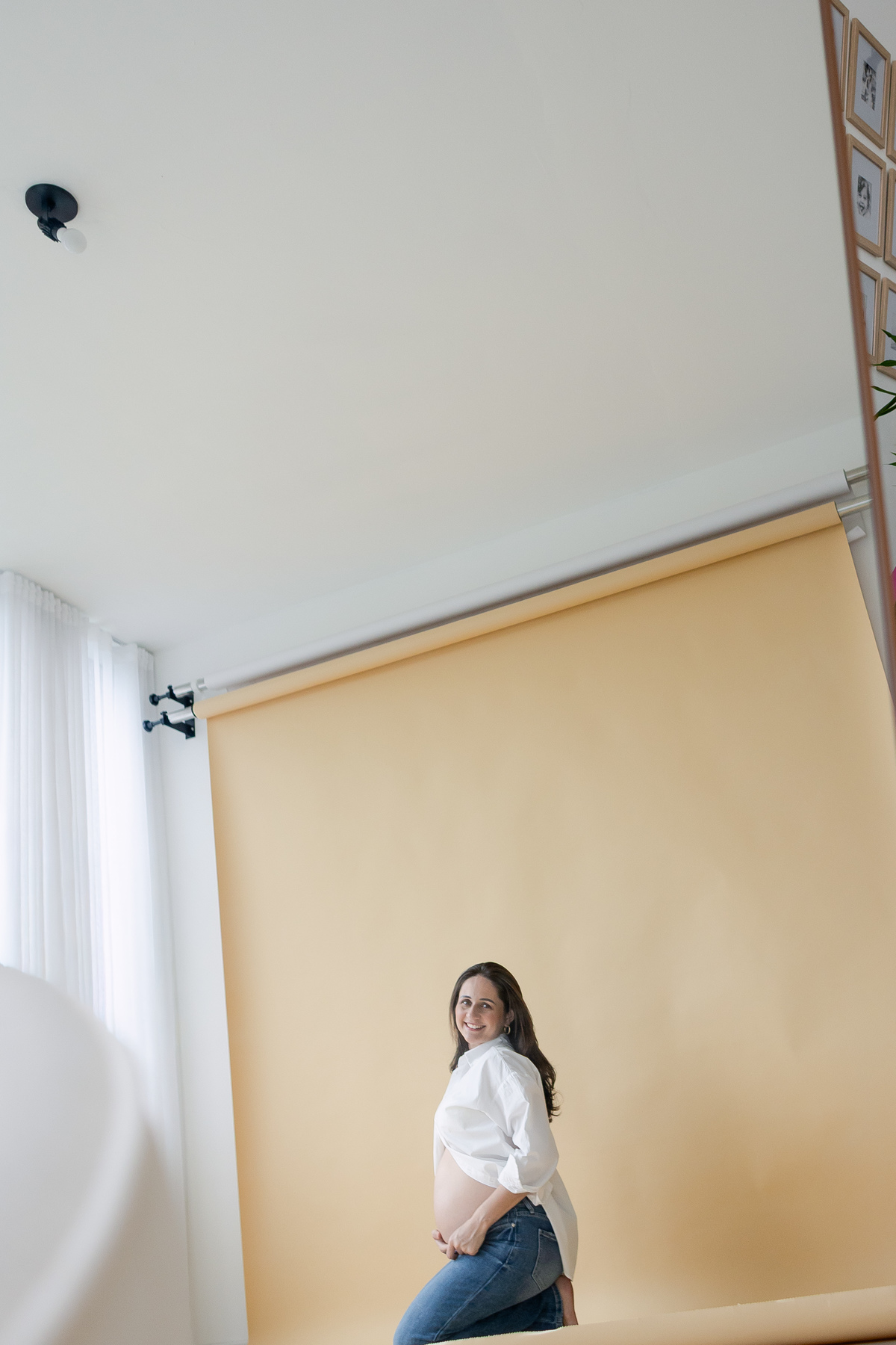 Ensaio de gestante no nosso estúdio minimalista de luz natural na Ilha do Governador. Com estilo leve e atemporal!