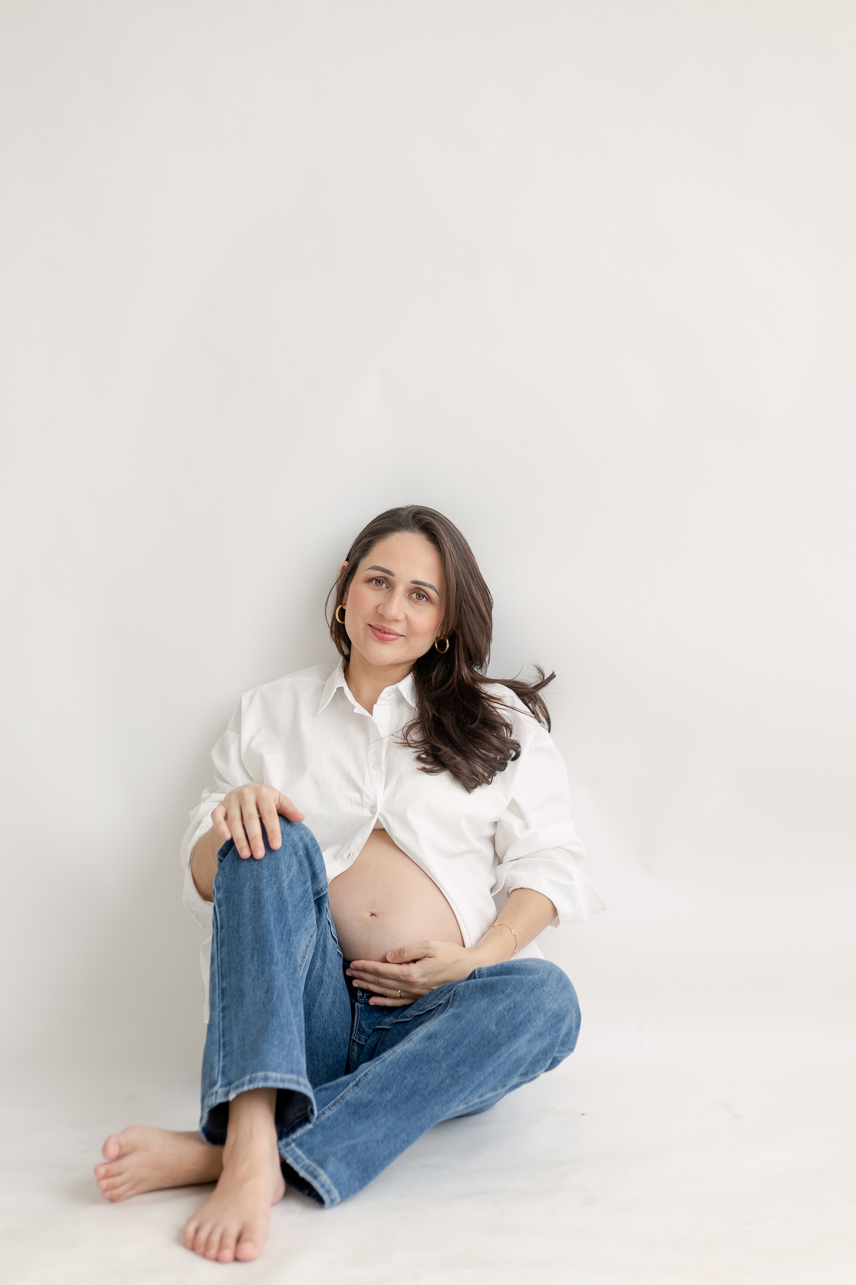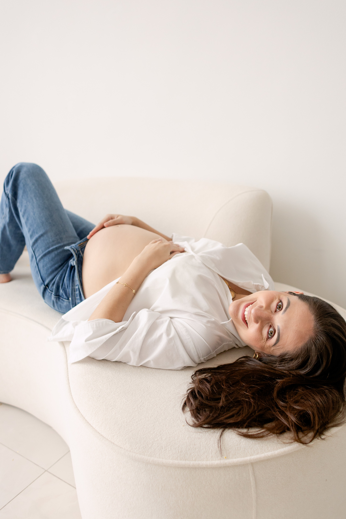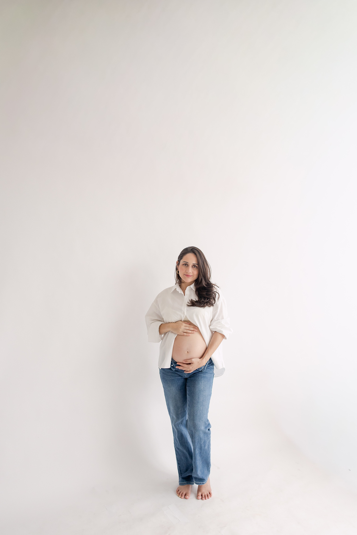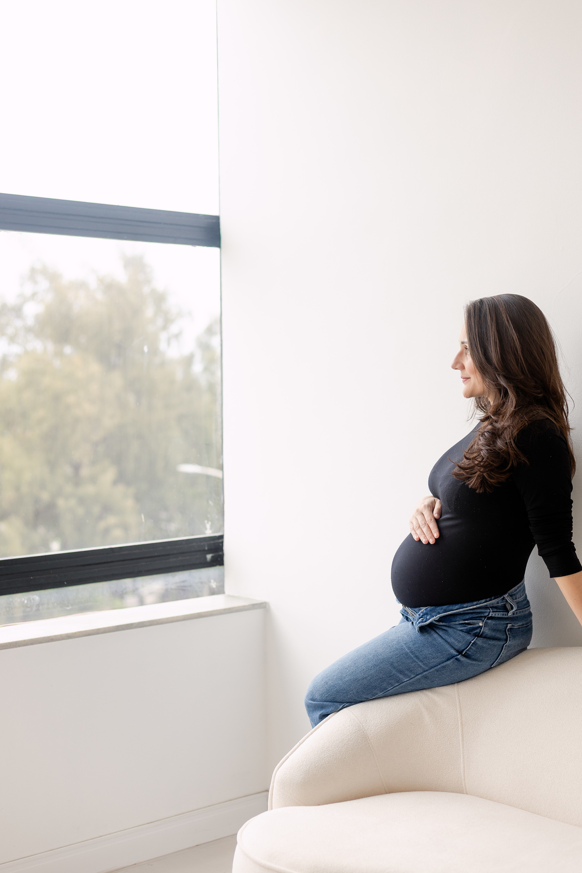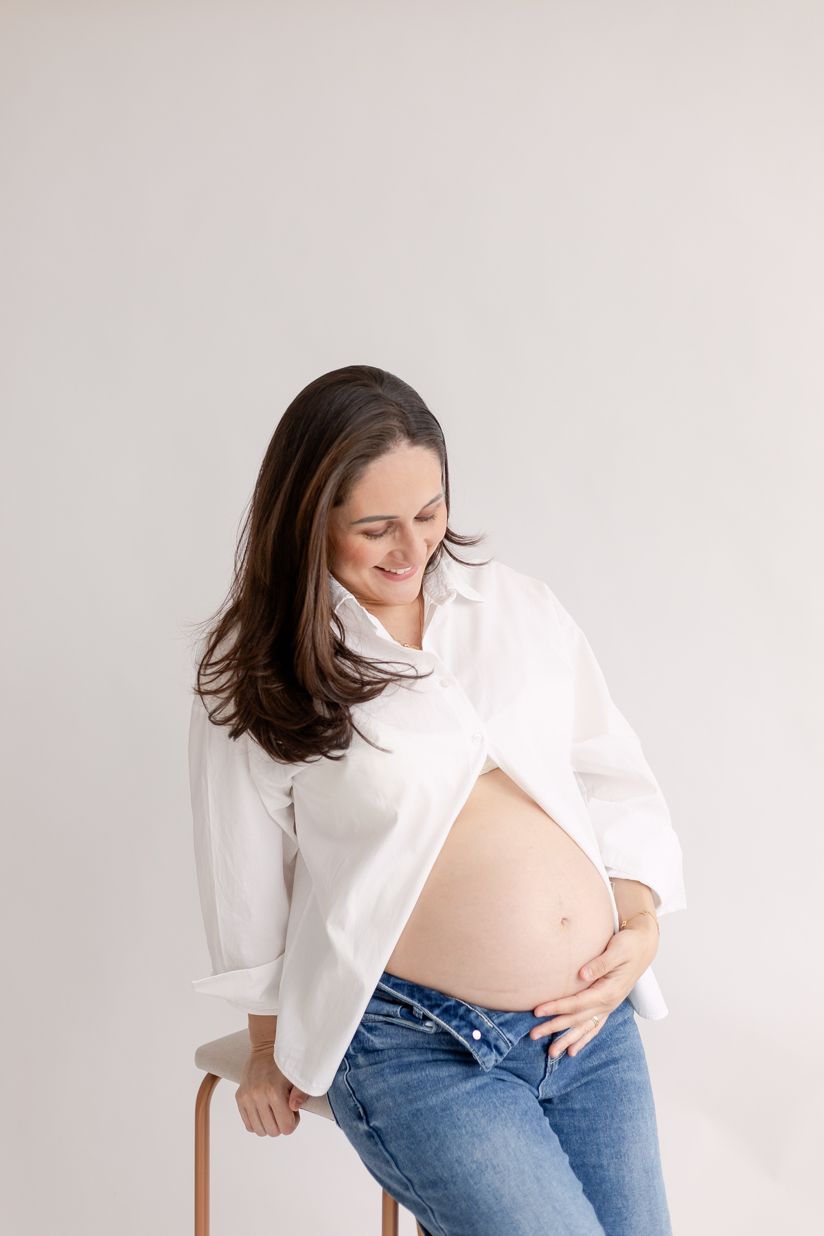 Ensaio de gestante no nosso estúdio minimalista de luz natural na Ilha do Governador. Com estilo leve e atemporal!